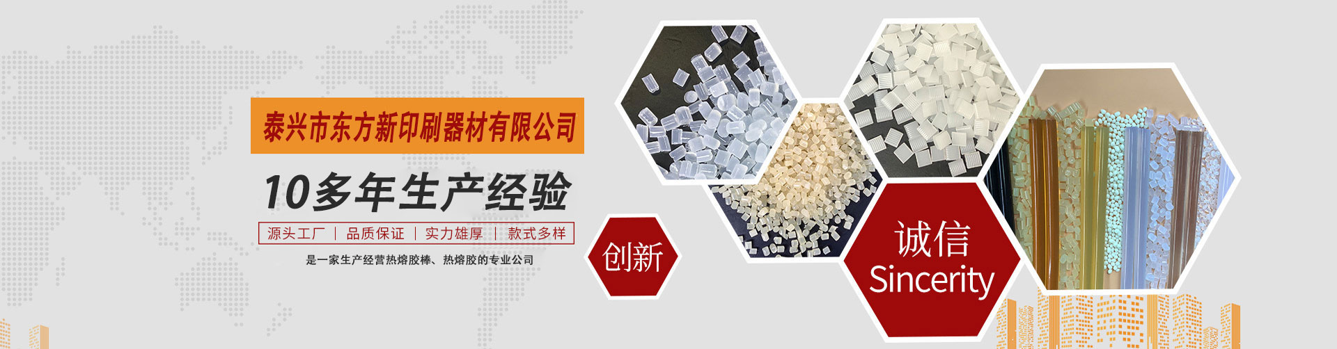 泰興市東方新印刷器材有限公司是專一生產綠色環保型印刷裝訂書刊熱熔膠,封箱包裝熱熔膠,吸管膠,鞋材熱熔膠,冰箱熱熔膠,熱熔膠棒,地毯背膠等。產品具有快速粘接、耐老化、強度高、熱穩定性好、無毒害等優點,廣泛用于無線膠訂、自動化封箱,飲料吸管粘結接,電子電器、工藝品、玩具、家具等領域,公司與多家科研機構建立了緊密的戰略合作關系,質量達到先進水平,產品已銷往全國30多個省市地區,并出品到東南亞多個國家和地區。    公司堅持“誠信為本,貼心服務”為廣大顧客提供優質產品,董事長兼總經理黃衛東先生攜全體員工,竭誠歡迎各界朋友光臨指導、洽談合作、共贏同發展。    Taixing Dongfang New Printing Equipment Co., Ltd. specializes in the production of green and environmentall…